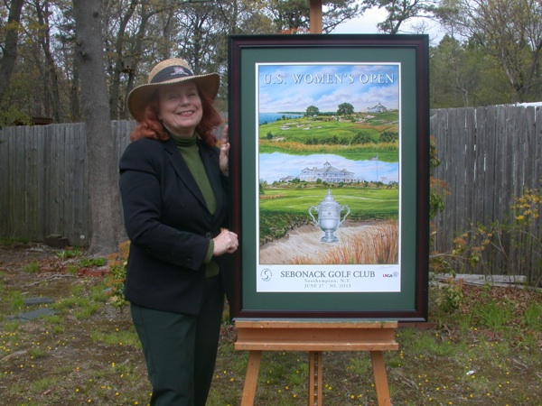 Long Island native, artist Elaine Faith Thompson was chosen to paint and design the 2013 U.S. Women’s Open Championship commemorative poster. The U.S. Women’s Open, conducted by the United States Golf Association, was held June 27-30, 2013, at Sebonack Golf Club in Southampton, N.Y. The 24” x 36”, archival, fade-resistant lithograph poster. Thompson signed the posters in the USGA merchandise pavilion during the championship. The original painting is also available for purchase. The poster is also available in an additional size of 18” x 24” at Sebonack. A limited quantity are left. After the Open, Thompson purchased a small quantity from the proshop at Sebonack to be available as a resale item.