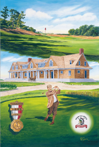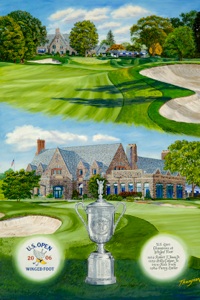 All 3 original oil paintings (24” x 36”) were commissioned by the United States Golf Association. This is the only collection in the world, of commissioned U.S.Open commemorative poster oil paintings for 2004, 2006 and 2009. In today’s market this investment is better than Gold. Thompson’s 2002 commemorative Painting “The Black Course - Bethpage” SOLD for $100,000 December 8, 2006 to a New York private collector. Every detail on the paintings is hand painted including the trophy, the logos and lettering. Every stone painted on the Wing Foot Clubhouse matches stones on the building. An art dealer in Southampton said “There are very few artists in the World who can paint this detailed.” It is because Thompson has an extraordinary close vision of 20-15. Her art is all hand-painted and never on the computer. For inquiries, to place a bid, or appointment for viewing call 631 589-0069 or etcreation@optonline.net